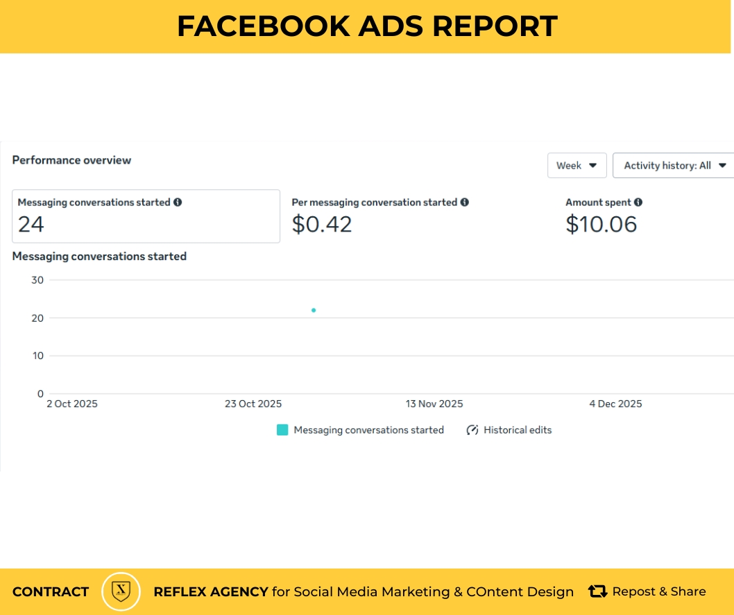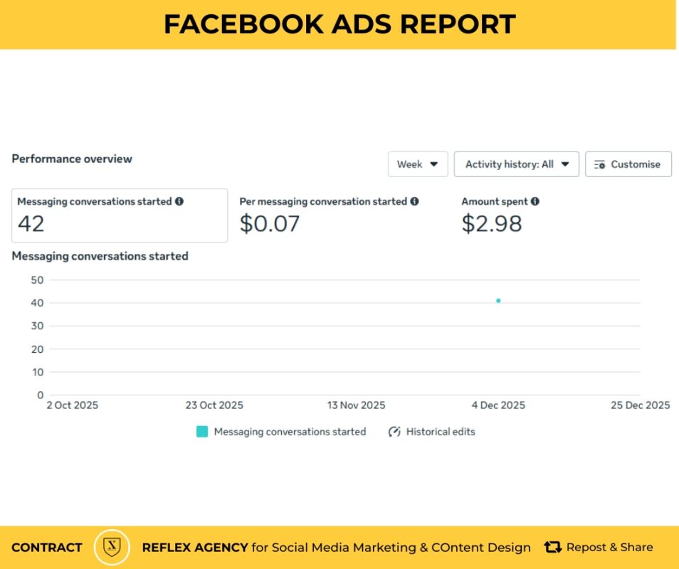 - Cost Efficiency: Your most recent performance of $0.07 per conversation is better than the peer average of $0.10. An earlier period in your report showed a higher cost of $0.14, which was 41% higher than similar ad sets.